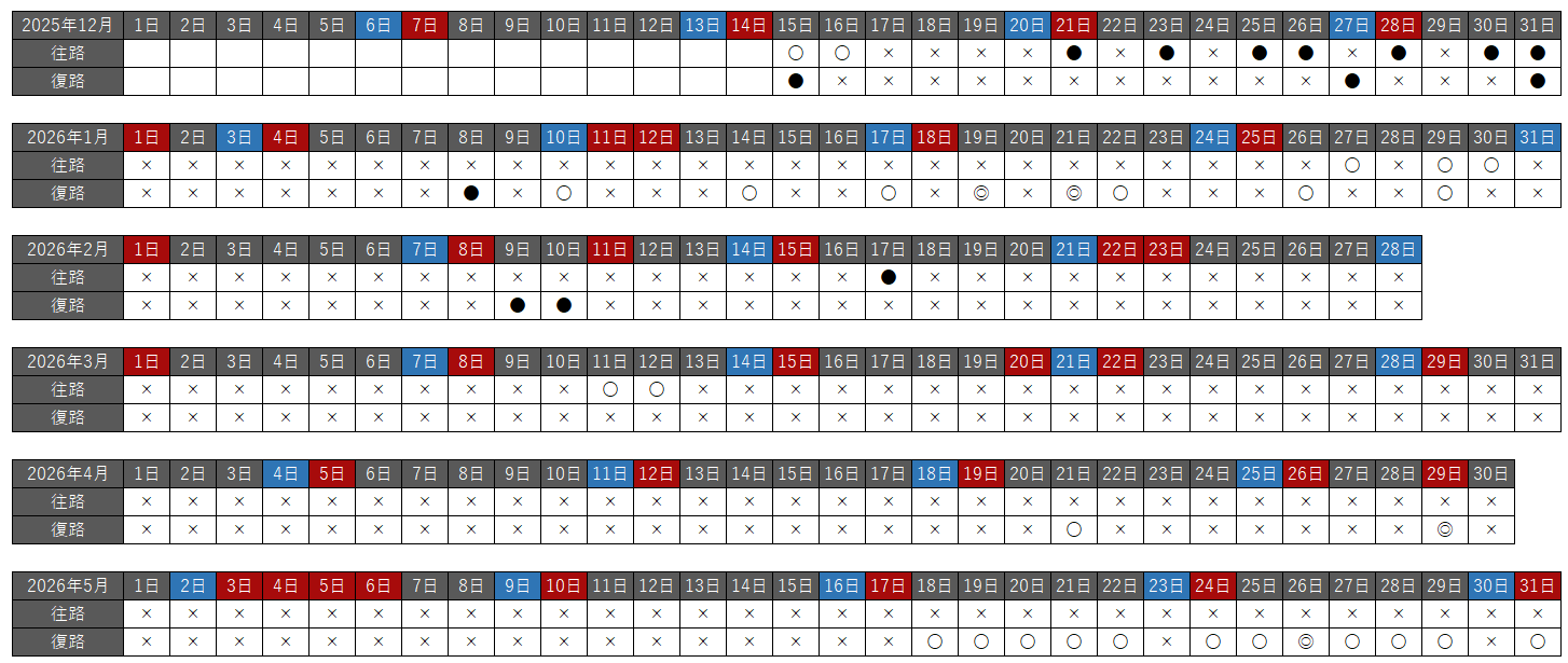 往路・復路それぞれで、空席状況を以下の種類で分けています。