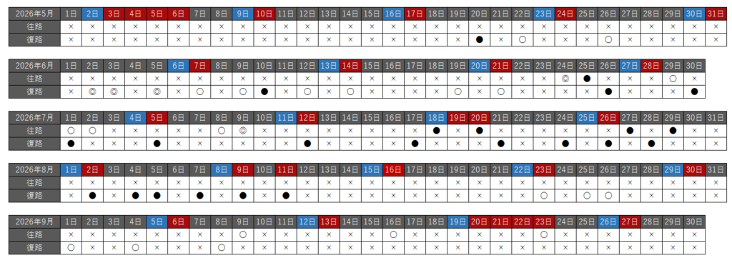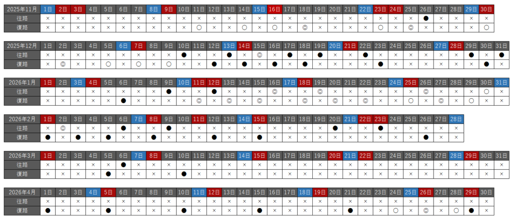 往路・復路それぞれで、空席状況を以下の種類で分けています。