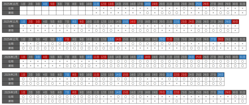 往路・復路それぞれで、空席状況を以下の種類で分けています。