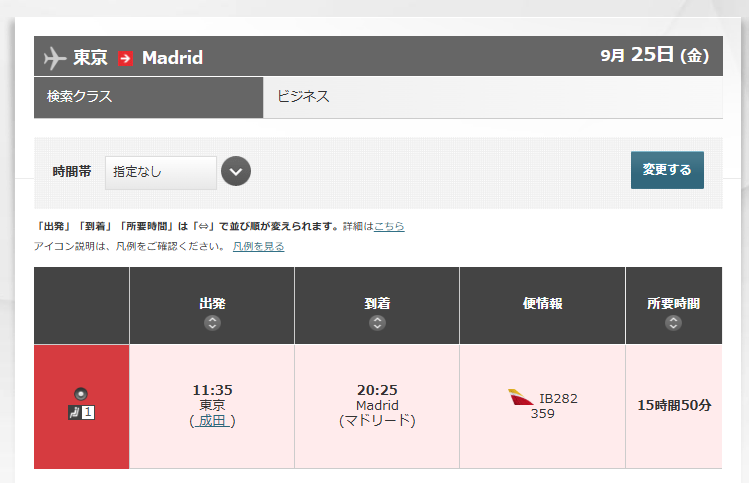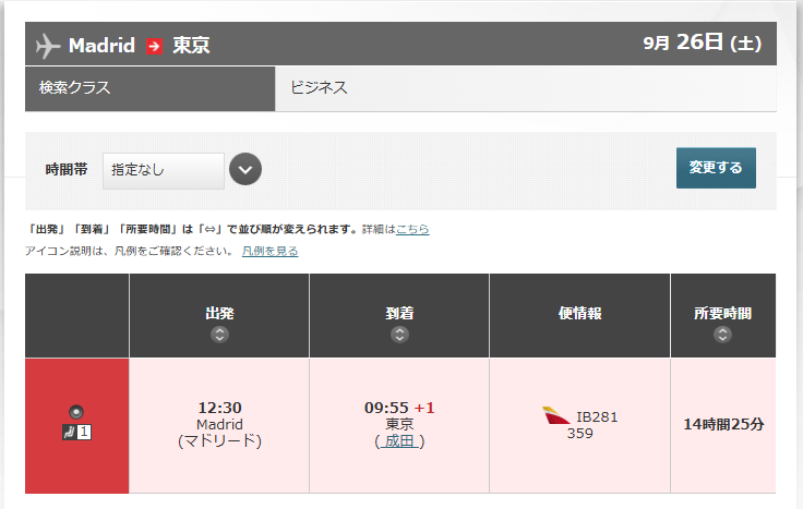 空いてるのは9月25日東京発と9月26日マドリード発のみです。