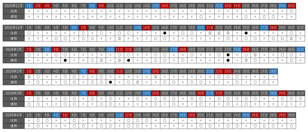 前回は3月末に変化が起きてて、水曜・土曜は飛んでないはずなのに、3月25日の水曜日に座席開放されてたんで、来年の夏ダイヤから土曜日を除いた週6日運航に増便する予定なのかな?と書きましたが、やっぱり週5運航で変わらずのようです。