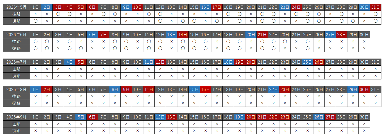 前回は3月末に変化が起きてて、水曜・土曜は飛んでないはずなのに、3月25日の水曜日に座席開放されてたんで、来年の夏ダイヤから土曜日を除いた週6日運航に増便する予定なのかな?と書きましたが、やっぱり週5運航で変わらずのようです。